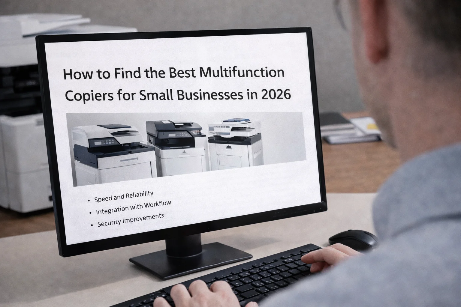 A desktop monitor in Buffalo displaying a guide for finding the best multifunction copiers for growing teams.
